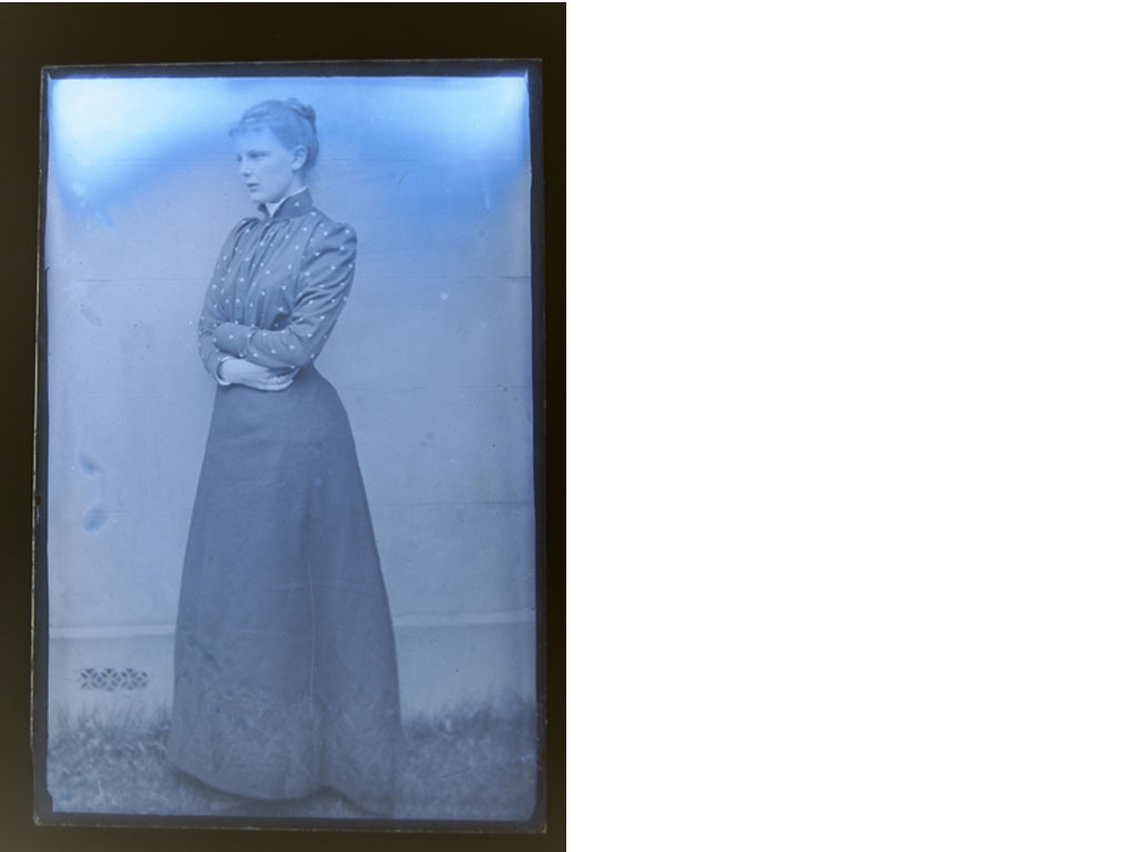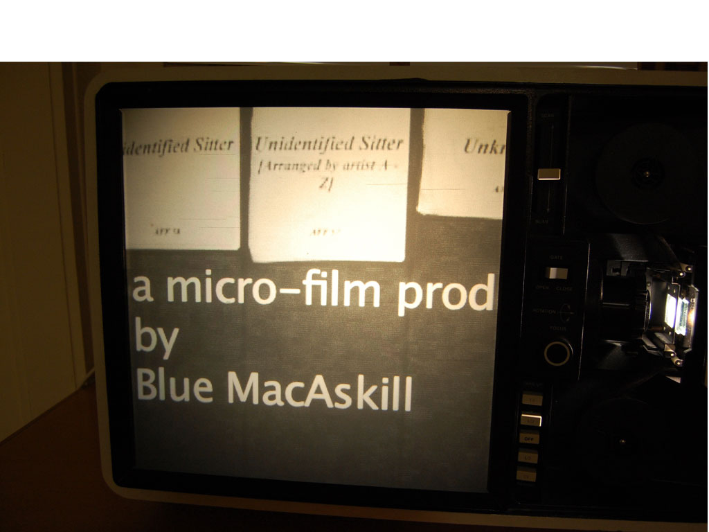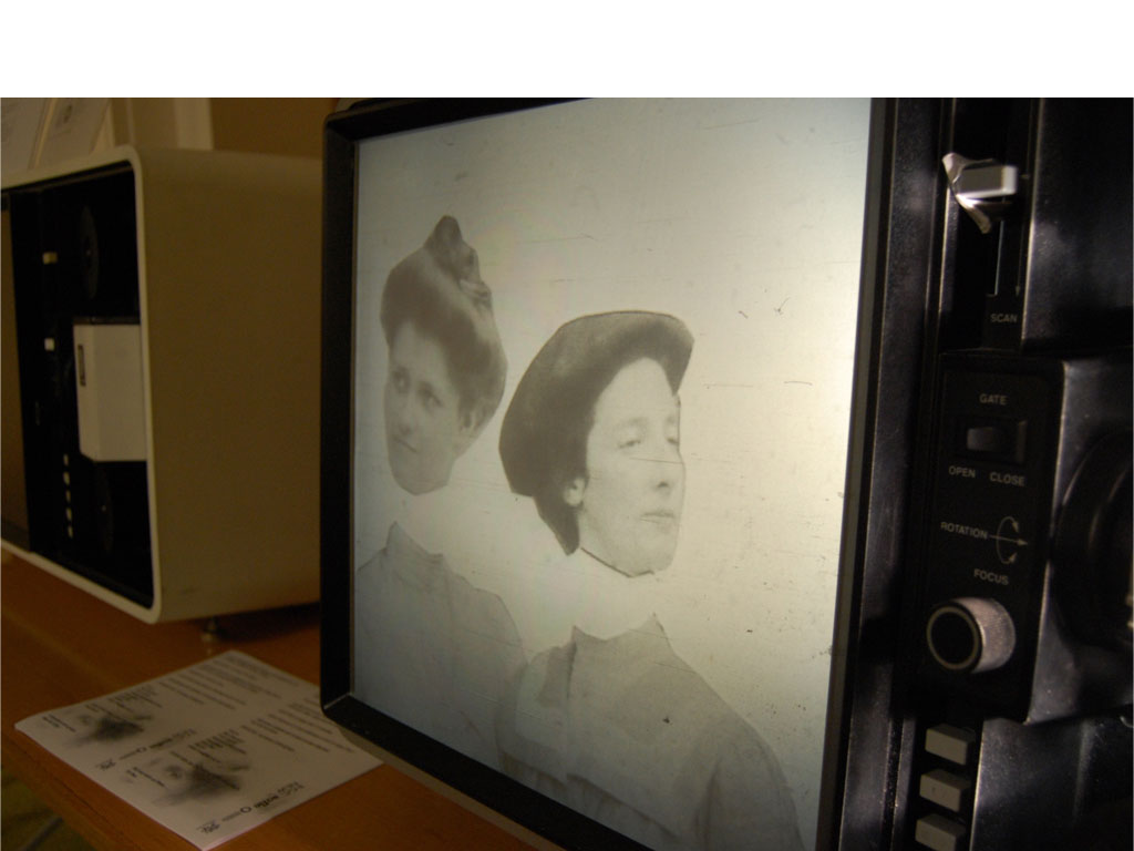 The artist responded to this task by creating a series of digital photographs and installations that explored notions of history, family and nostalgia. Focusing on the photographic collections held at the library and specifically on a series of magic lantern slides, she re-interpreted these for a twenty-first century audience. Magic Lantern slides are highly volatile, due to the manufacturing process and therefore cannot be readily viewed today. In order to utilize these images she digitally photographed each before re-using them. In one particularly interesting artwork she then chose to remake the images as microfiche. Thereby again rendering the images into a now, all but defunct technology.